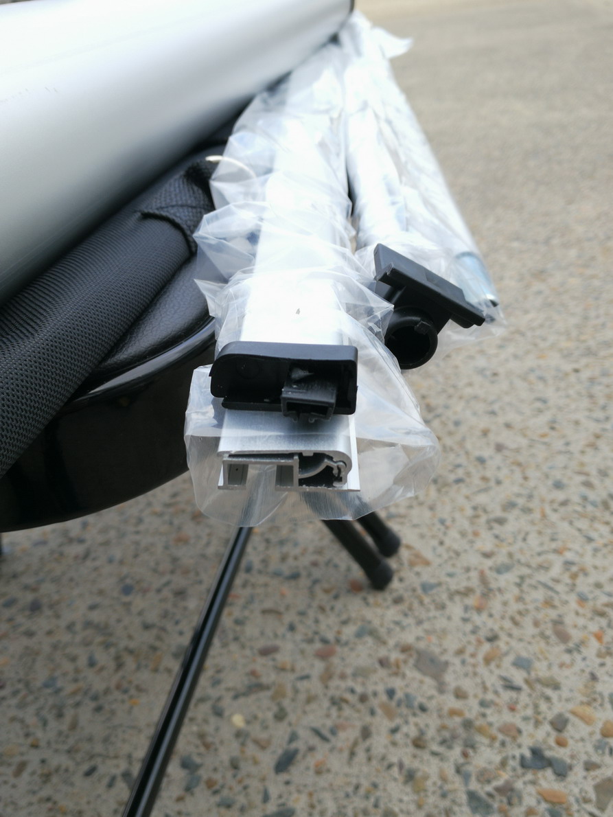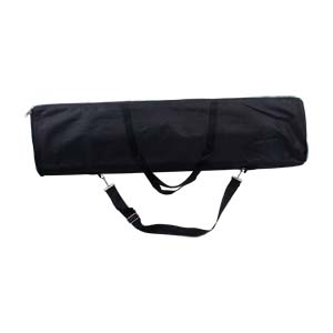 Heavy flat base with snap clip top crossbar. Padded protective bag.
