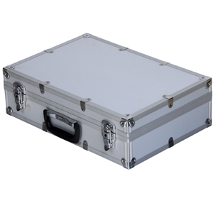 The "Z" Shape brouchour holder provides 2 sided access. Chromed steel and aluminum frame, perforated bakelite panels. Easy to be pull up and locked in the place. Contained in a padded silver aluminum carrying case
