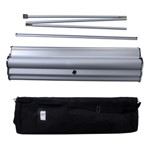 Heavy, strong flaten base with Snap-in profiles on the retractabe roller, Strong stand support pole, snap-in top crossbar. Padded protectve bag